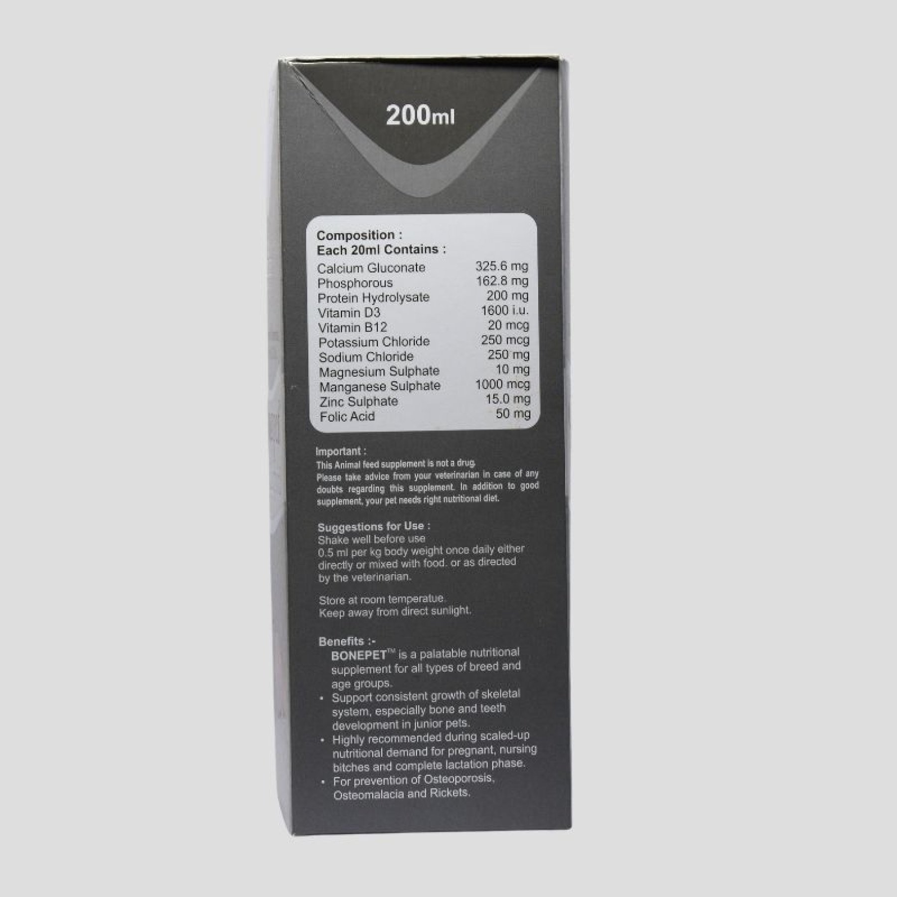 BonPet by VetLife Animal Health is a premium liquid calcium supplement designed to promote strong bones, healthy teeth, and improved muscle function in animals. Enriched with essential minerals like calcium, phosphorus, and magnesium, BonPet is formulated to support skeletal development, prevent calcium deficiencies, and enhance overall mobility. Its easy-to-absorb liquid form ensures maximum effectiveness, making it ideal for growing, lactating, and aging animals.